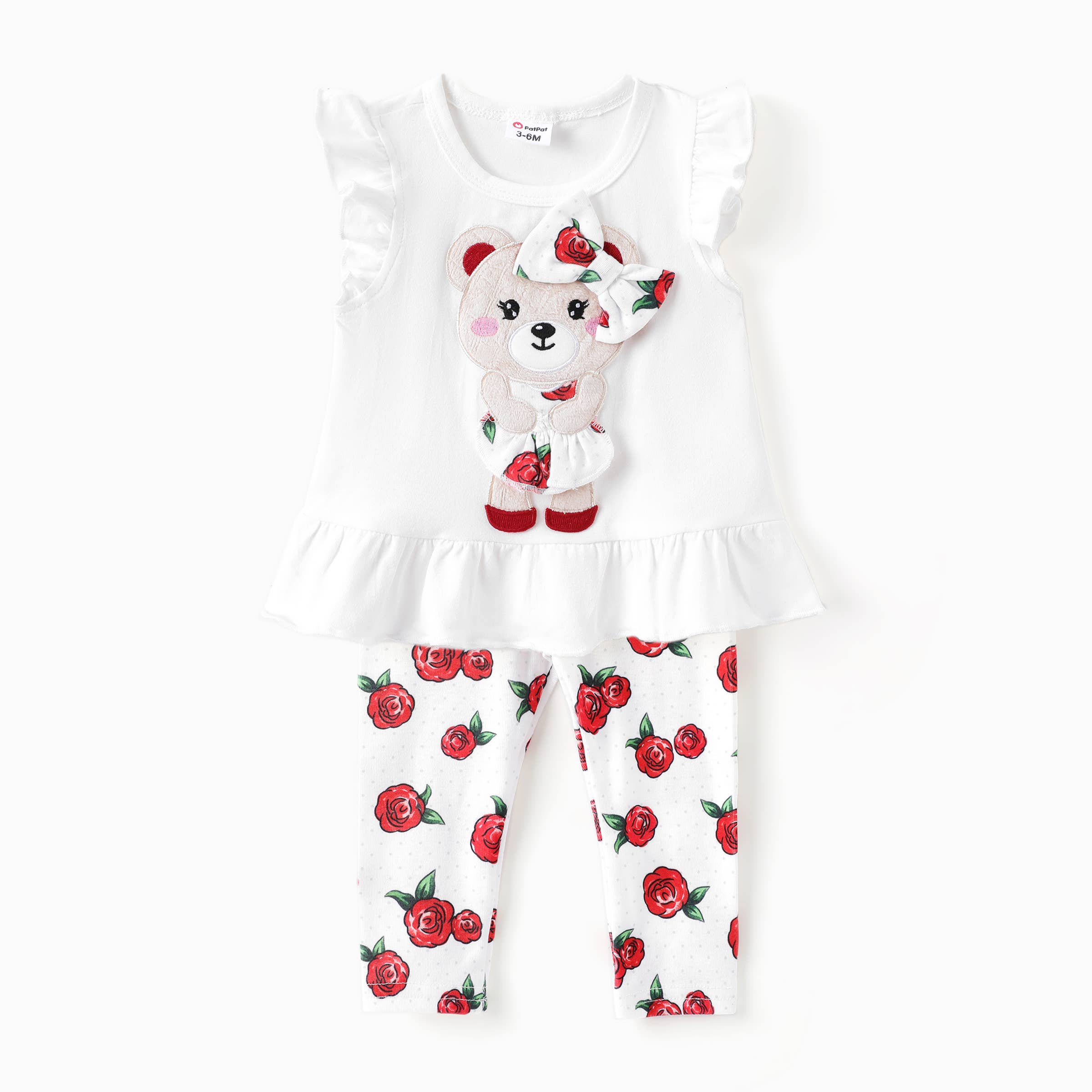 Baby/Toddler Girl 2pcs Bear Print Ruffled Top and Floral